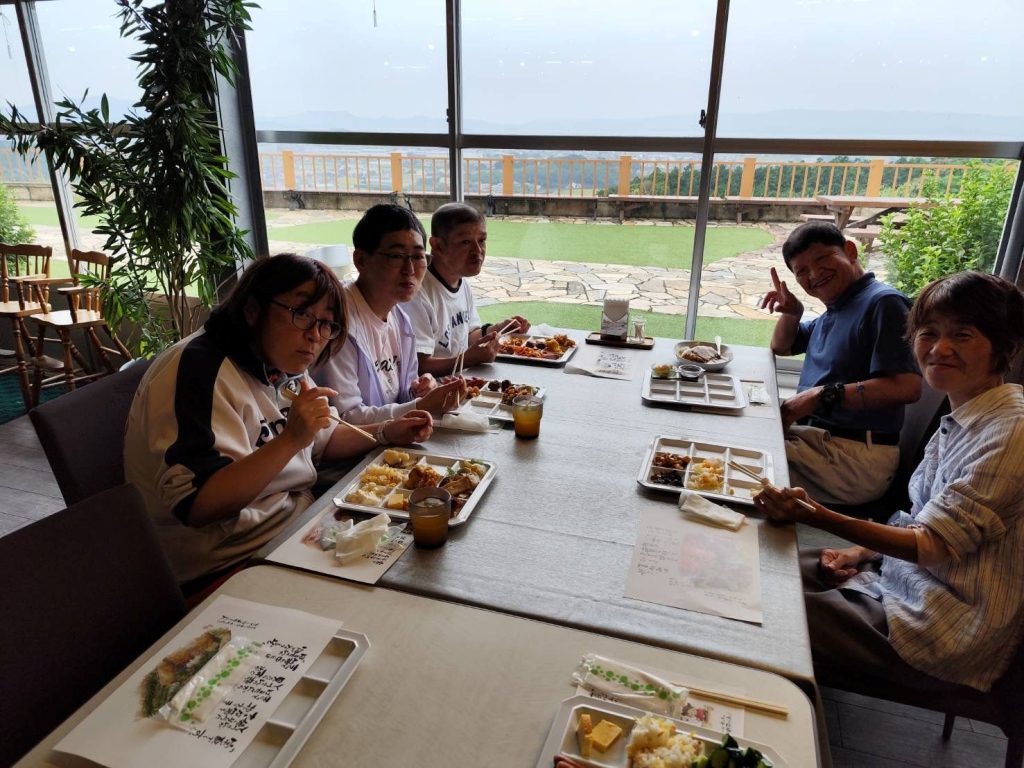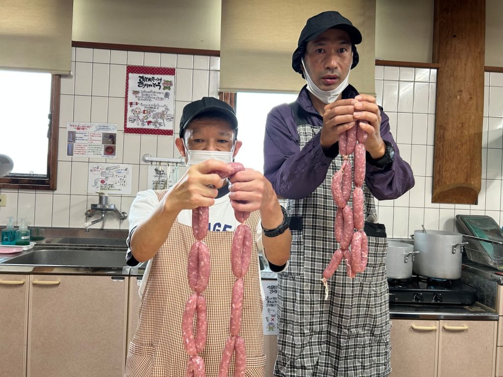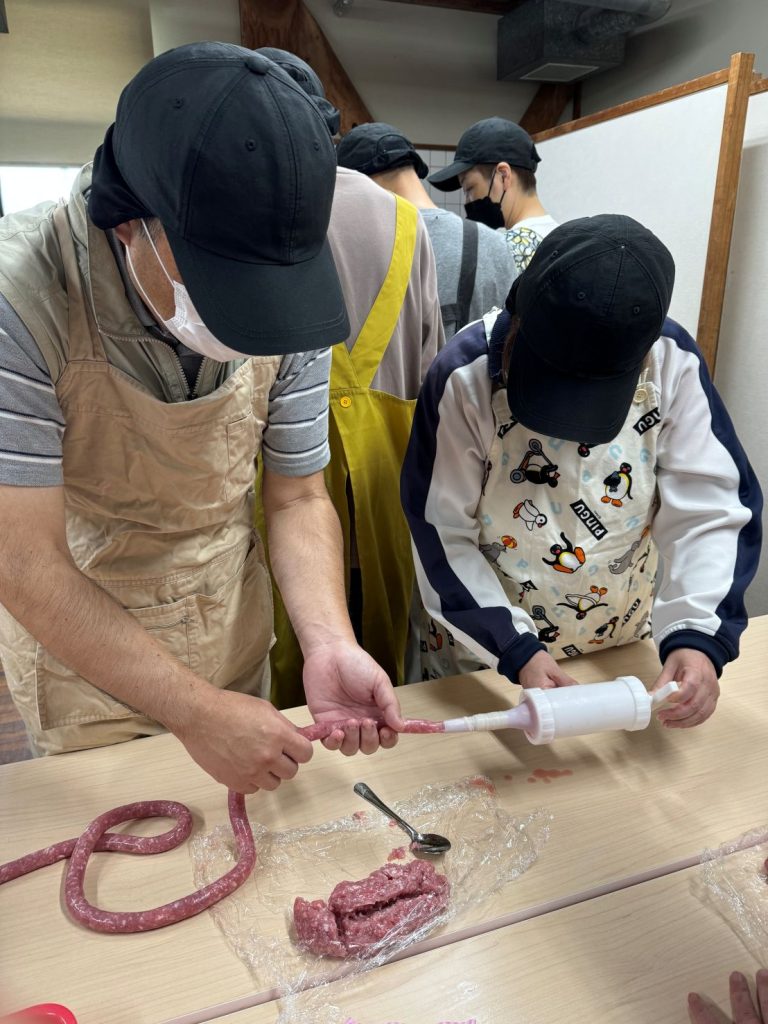10月2日に大村市にある、ゆめファームシュシュに日帰り旅行に行き、手づくりウインナー体験を行いました。 手づくりウインナー体験は、はじめてという方も多く、みなさん真剣に説明を聞かれていました。 説明が終わるとそれぞれのテーブルで道具を使って、羊の腸にお肉を詰めましたが、 お肉を入れる人と腸を引っ張る人が息を合わせて行う必要があり、難しく感じた方もいらっしゃったようです。 しかし、最後にウインナーが完成したときには、頑張った分の達成感を味わうことができたように思います。 ウインナー作りが終わるとみなさん楽しみにされていたバイキングの時間でした。 一度で山盛りに取ってくる方や少しずついろんな種類を取ってくる方など、みなさんの個性がでていました。 満腹になってからは買い物に行き、果物やお菓子、キーホルダーなど思い思いの物を購入して、帰路につきました。 みなさん、久しぶりに仕事から離れて、リフレッシュができたのではないでしょうか。 また、来年の旅行を楽しみに日々の仕事を協力しながら取り組んでいきたいと思います。