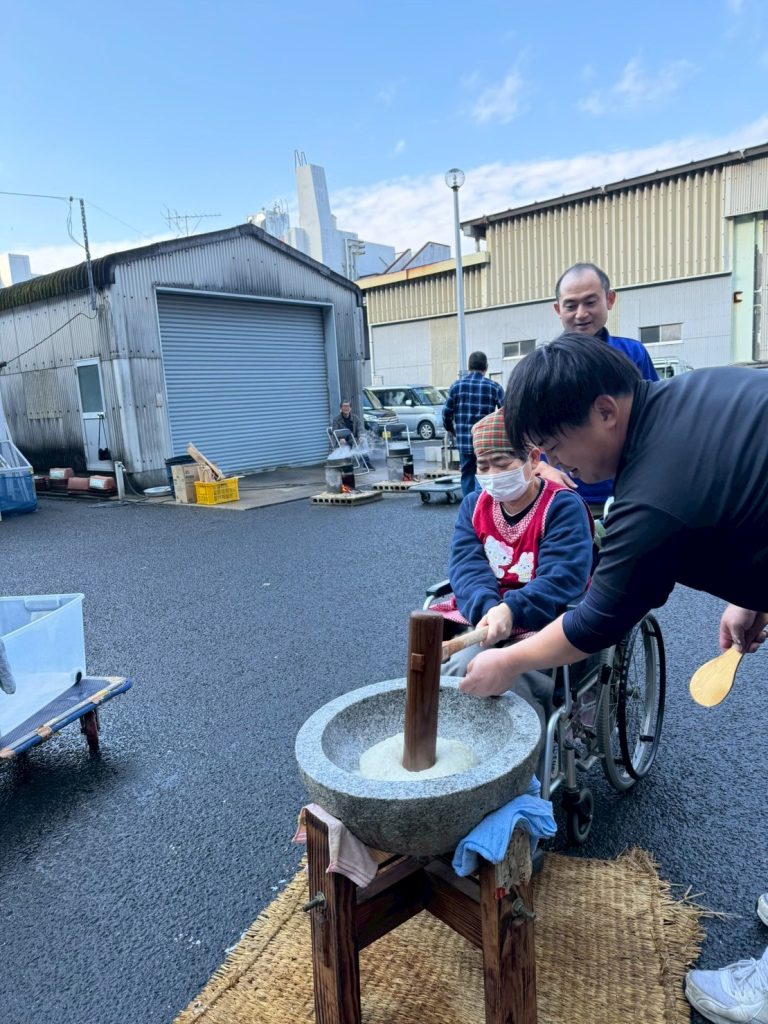 令和7年度 もちつき大会 活動報告:おおぞら作業所 12月20日(土)にもちつき大会を開催しました。 昨年度は悪天候のため杵つきを行うことができませんでしたが、今年度は天候にも恵まれ、杵つきを行うことができました。 当日は、よい天候の中、利用者の皆さんが気持ちよさそうに杵を振り、元気な掛け声も聞かれ、たくさんの笑顔が見られました。もち米を蒸す工程を興味深そうに見学する利用者さんや、杵つきの様子を見学する利用者さんの姿もあり、それぞれの形で行事を楽しまれていました。 餅丸めでは、普段あまり関わりのない利用者さん同士が、パックを広げてあげたり、餅を分け合ったりするなど、助け合う姿も見られ、和やかな雰囲気が感じられました。 今年度は、時間や場所が例年とは異なる形での実施となりましたが、保護者の皆様のご協力もあり、利用者の皆さんに楽しんでいただけた餅つき大会になりました。 当日お休みされた利用者の皆さんにも、後日、餅つき大会でついたお餅を渡すと、とても喜ばれていました。 来年度も、利用者の皆さんの笑顔がたくさん見られる、楽しい餅つき大会にしていきたいと思います。